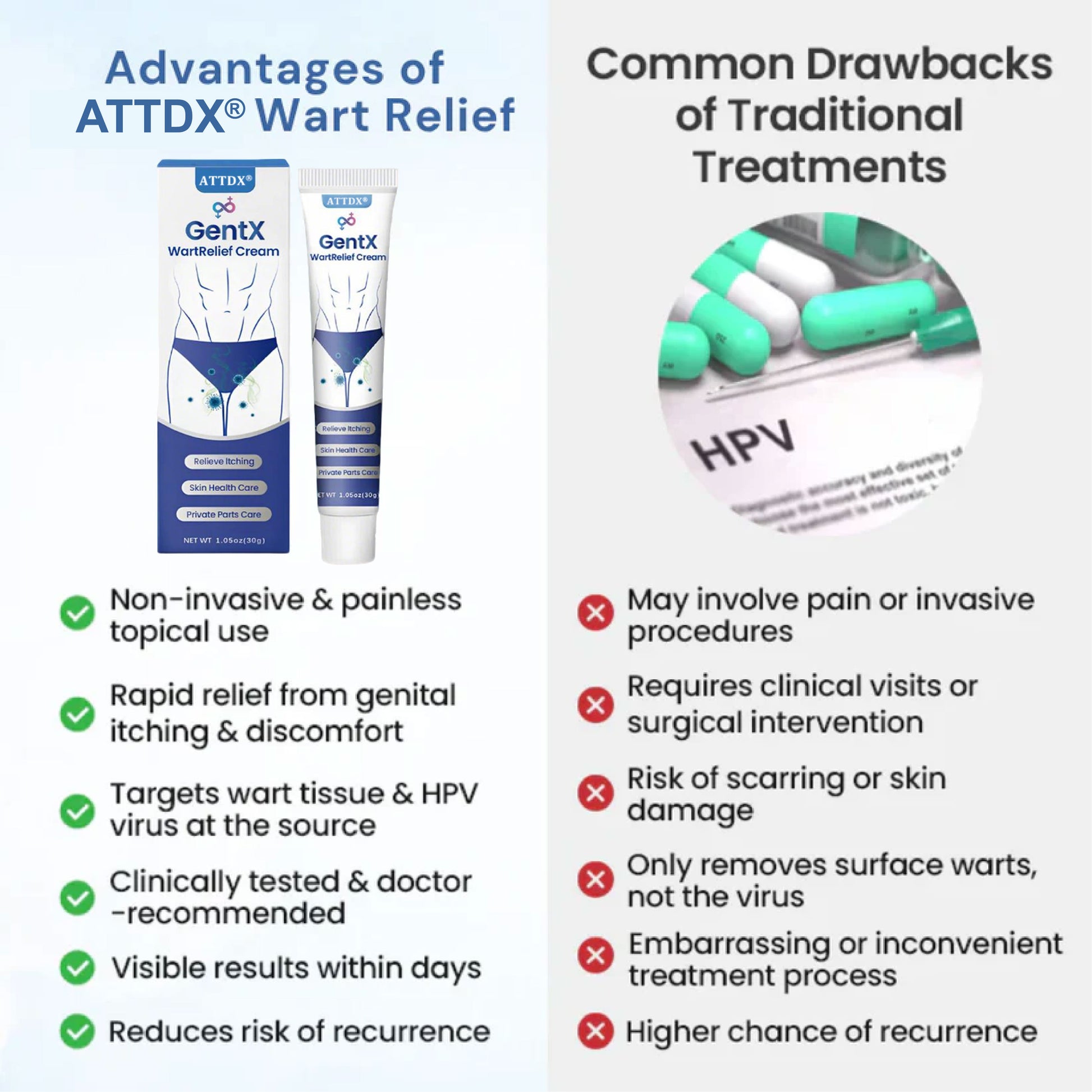 ATTDX® GentX WartRelief Cream blends time-tested natural-inspired actives with advanced delivery technology to do what harsh acids and freezing can’t—clear warts at the root and help prevent them from coming back.