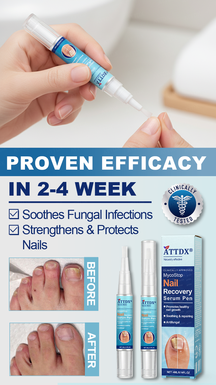 ATTDX® MycoStop Nail Recovery Serum Pen is specially designed to reach beneath the nail plate, targeting fungal infections where ordinary creams cannot. Its precision applicator makes treatment simple, mess free, and effective for daily use. It helps restore nails to a clearer, smoother, and healthier state.