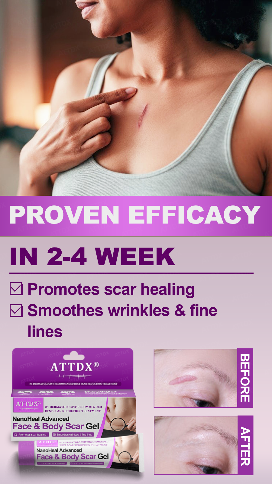 Scars don’t have to steal the spotlight—ATTDX® NanoHeal Advanced Face & Body Scar Gel helps fade their appearance while keeping skin smooth and nourished. With Allium cepa and medical-grade Silicone, it boosts repair and locks in hydration so your skin bounces back beautifully