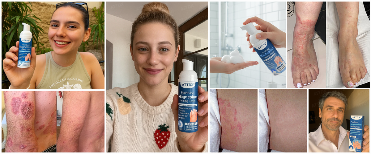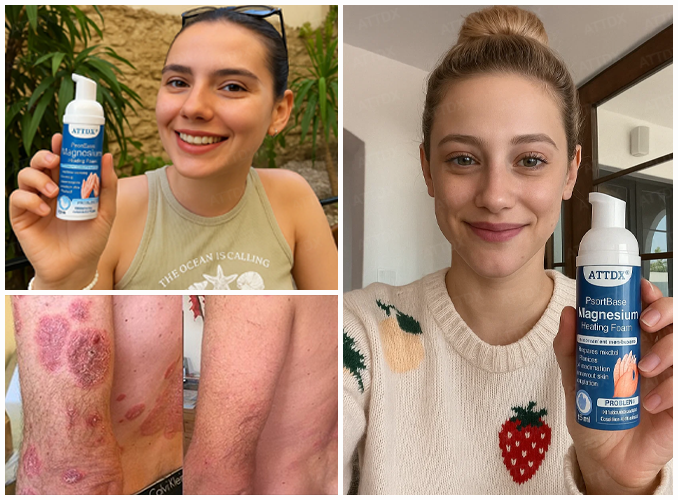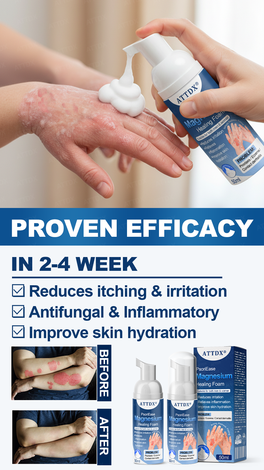 Say goodbye to stubborn skin struggles with ATTDX® PsoriEase Magnesium Healing Foam—a soothing fix for itching, redness, flaking, cracking, and discomfort from skin problem and more.